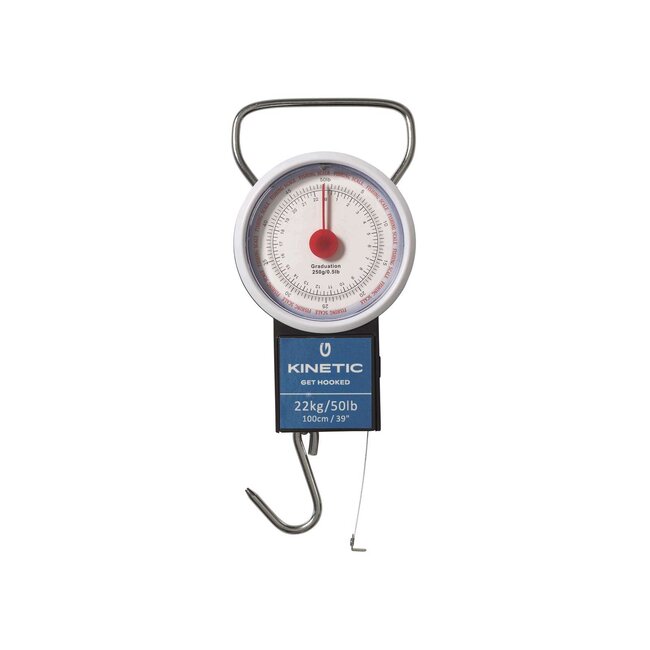 Handige compacte weegschaal van kinetic die weegt tot 50lb oftewel 22kg, die ook voorzien is van een rolmaat tot 1 meter.