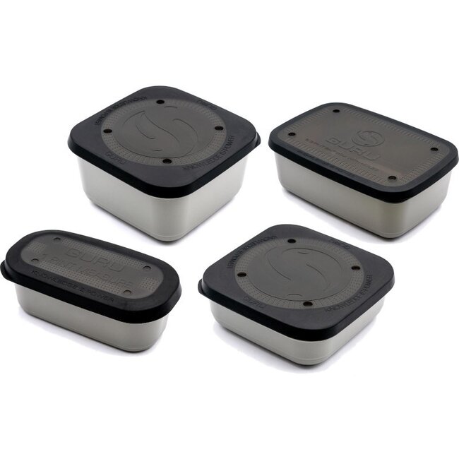 De nieuwe guru grey conti bait box isverkrijgbaar in 1.1, 2.2, 3.3 en 5.3 pint opties en met ademende deksels, ideaal voor levend aas.