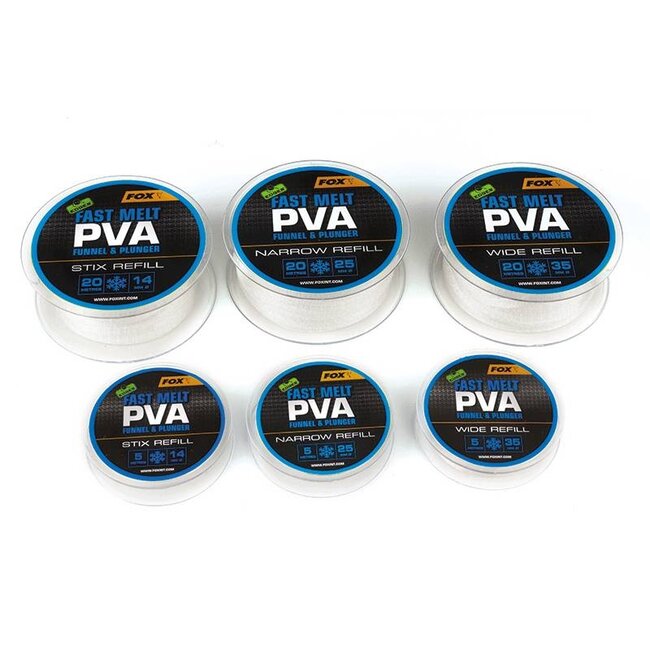 Fox pva is van de allerbeste kwaliteit en deze versie smelt snel.Het is leverbaar op een wide (35mm), narrow (25mm) en super narrow (14mm) koker in fast melt of slow melt. Inhoud: 5 meter