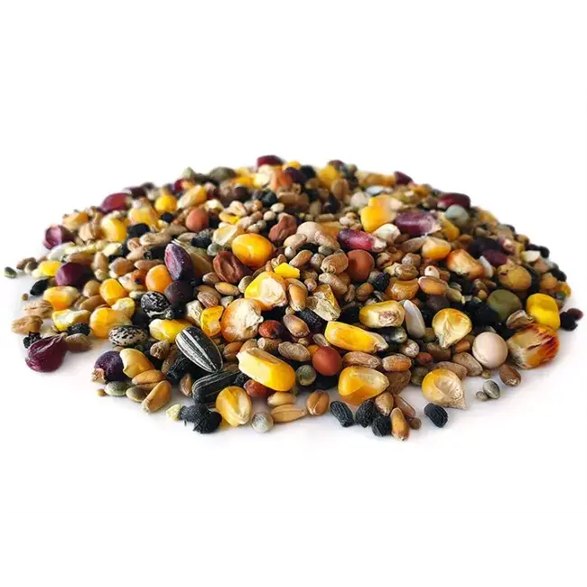 Deze mix bestaat onder andere uit: maïs, tarwe, dari, erwten en zonnebloempitten.